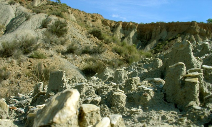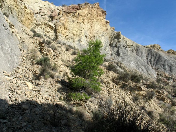 Siguiendo por el cauce del barranco, aguas arriba, hasta el Saltador, volveremos a ver numerosos paleodeslizamientos, pero también debemos observar las morfologías que las aguas de escorrentía modelan sobre las margas, como las cárcavas y pequeñas chimeneas de hadas. O los depósitos existentes en el cauce de la rambla. Se trata estos últimos de barras de gravas que en numerosas ocasiones están condicionadas por la existencia de vegetación arbórea o arbustiva, que frena las aguas obligándolas a depositar los sedimentos que arrastra en las zonas del cauce con más vegetación, lo que nos ilustra sobre el importante papel que juega la vegetación en el control de la erosión.