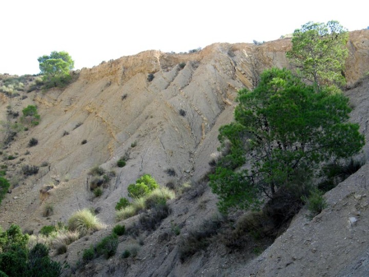 Desde la parada 3 al final del recorrido por el cauce del barranco del Mulo podemos admirar y deleitarnos con las numerosas estructuras que han originado los fenómenos tectónicos de la orogenia Alpina. Desde la ladera norte del cerro Algezar, sobre una terraza cuaternaria, se puede observar una panorámica de este barranco. A nuestra derecha vemos la cresta que forman los estratos subverticales de la Loma de Planes, de cuya ladera sur parte un glacis muy llano que contrasta con el relieve agreste de la cresta. También podemos ver el cerro del Saltador desplazado hacia el norte por una falla de desgarre y parte de un isleo tectónico formado por sedimentos triásicos.