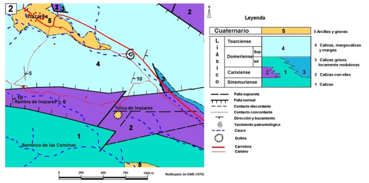 La dolina se ha originado sobre unas calizas de color gris-marrón, ricas en nódulos y niveles de sílex anaranjado, muy fracturadas, que en ocasiones presentan una abundante fauna de belemnites y ammonites (2 de la figura 2), que aparecen englobadas en una potente formación de calizas poco fosilíferas y sin apenas sílex (1 de la figura 2), muy bien representadas en las proximidades del barranco de las Conchas.
