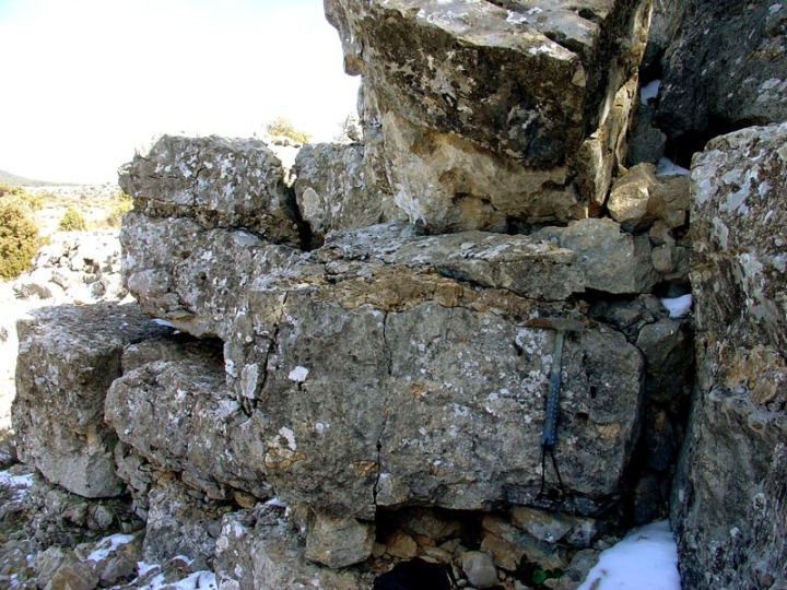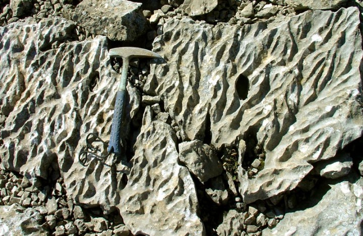 En estas calizas (1) también aparece incluido un tramo de calizas grisáceas, ocres o amarillentas en la base, que hacia el techo pasan a margas y margocalizas con desarrollo de hard grounds (suelos endurecidos) ricos en restos de ammonoideos (Tropidoceras sp., Crucilobiceras sp., Fucciniceras, Protogrammoceras sp., Phylloceras sp., etc.) y belemnites (3) que aparece escasamente representado al noreste de la dolina.