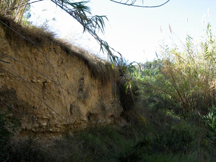Una erosión preferencial semicircular, horizontal y paralela a la rambla. Son los antiguos canales subterráneos por donde circulaba el agua, antes de que se abriera la rambla.