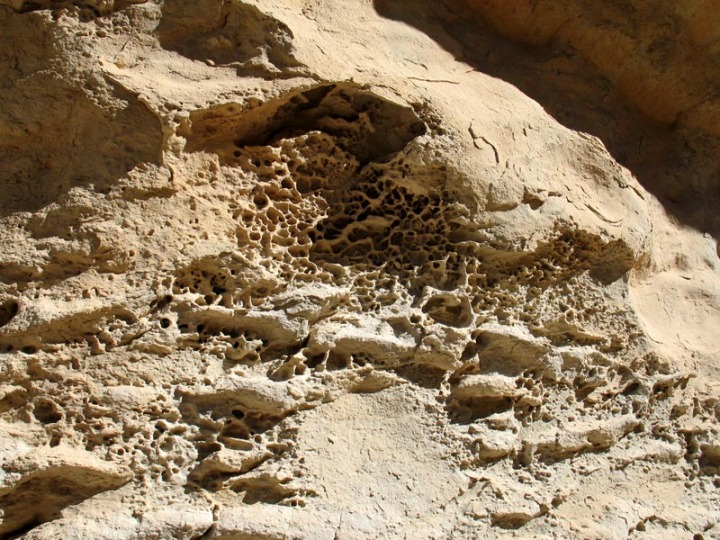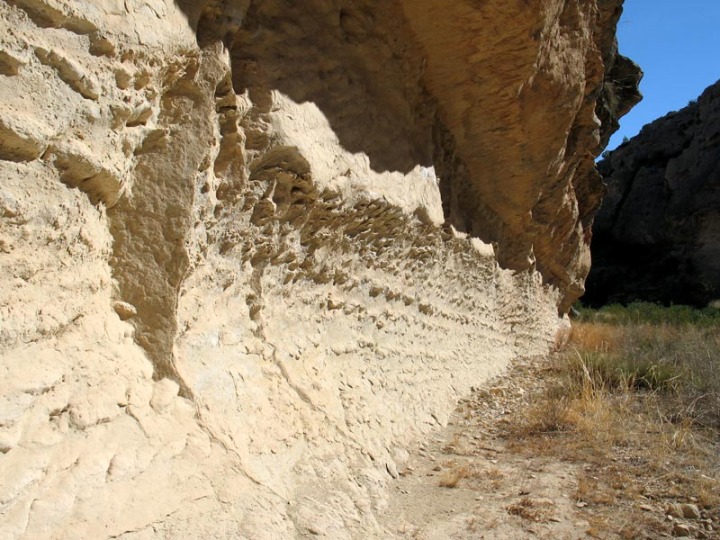 Unos cuantos metros más adelante, la pared aún se hace más grande, impresiona a la vista, hasta tal punto que en ella se practica la escalada. Las huellas dejadas por los organismos marinos en estos fondos arenosos, es decir las bioturbaciones, y una erosión en alvéolos, son dos de los rasgos geológicos más característicos que adornan sus areniscas.
