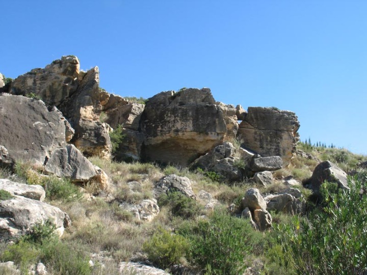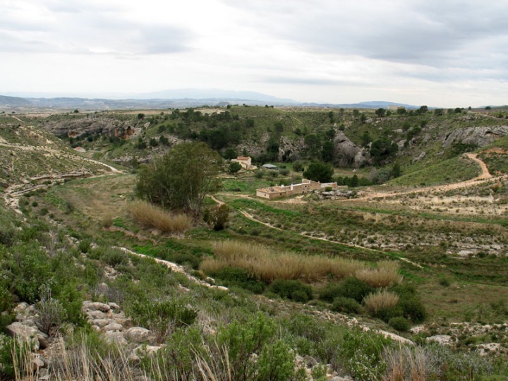 Más abajo está el paraje de las casas de los Pavos y de la Cueva. Limitado también por areniscas marinas, ya las intercalaciones de margas son más abundantes. Este paso de areniscas a margas, este cambio de facies, nos indica que nos estamos sumergiendo en ambientes más profundos de ese extinto mar. Las terrazas fluviales son comunes, incluso hoy día se están aprovechando para el cultivo.