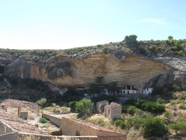 El nombre de la casa de la Cueva se debe a que sus constructores aprovecharon otro gran abrigo natural realizado por los procesos geológicos externos en estas areniscas con el paso de los años. Esta vivienda, pese a la ilusión de sus dueños que ha quedado reflejada en el esmero de la construcción, está abandonada. Con la realización de esta obra quizás se perdió otro bonito rincón de la rambla, pues impide al visitante ver la cueva en su estado natural. Paradójicamente cuando estuvimos allí para hacer este lugar de interés geológico, había una libreta de algún niño, abierta por los apuntes sobre geología. Sobre esta casa sí se puede observar bien una impotente pared de areniscas que presentan laminaciones cruzadas. Estas capas, que se entrecruzan entre sí, fueron originadas hace unos siete millones de años por el agua del mar al desplazar las partículas de arena, son dunas submarinas.