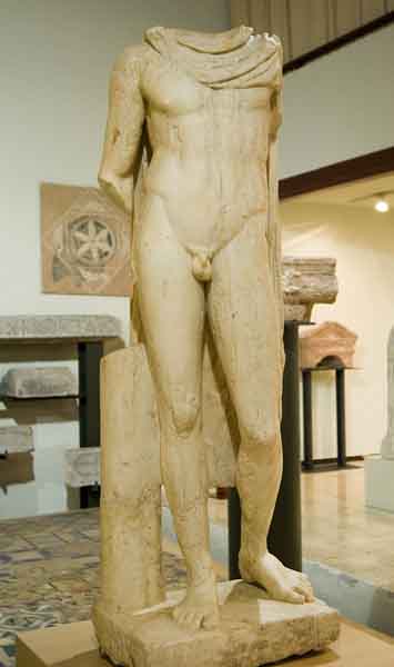 Frente a la austeridad de la joven con peplos tenemos un modelo más propio del tardorepublicanismo o, en todo caso, propio de la colección de copias griegas que tanto abundaban por el imperio: el joven con clámide. No es que los desnudos fueran desterrados de la iconografía augustea, pero sabemos que la renovación del emperador Octavio optó más por modelos togados y militares en caso de tratarse de personajes relevantes. Este joven desnudo, solo cubierto con una clámide, podría haber formado parte de la iconografía expuesta del foro, la falta de precisión en la escultura en su parte trasera hace pensar en que su visión solo sería frontal y podría estar expuesta en un nicho.
