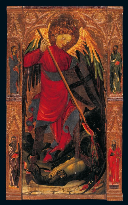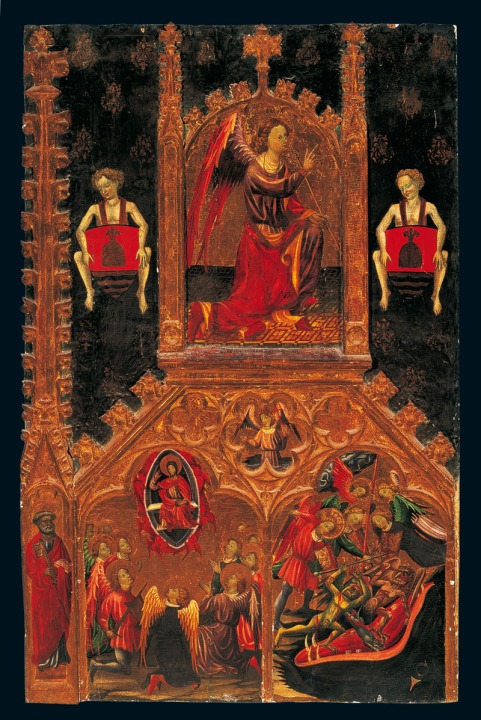 Que el arcángel venza al Diablo, representado como un dragón, es solo parte de una extensa línea, podríamos decir divulgativa, que recuerda al espectador el Juicio Final de las almas y los peligros a los que esta queda expuesta en su camino de trascendencia. Las alusiones al cielo, al infierno y al purgatorio son claras y quedan jerarquizadas de manera vertical en todo el políptico, pero en escenas independientes.