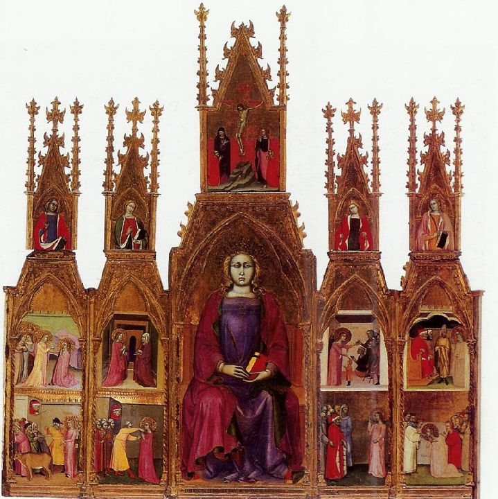 Bernabé de Módena trabajaba en las ciudades de Pisa y Liguria y su estilo pictórico estaría anclado siempre en la inspiración bizantina. Esta tabla, a la que faltan los remates superiores, representa a la Virgen María amamantando a Jesús, un tema muy común en la iconografía románica y gótica. Además del tema principal podemos ver escenas de la Anunciación y el Juicio Final y a diversos santos, Santa Ana, Santa María Magdalena, Santa Clara, San Antonio Abad, Santa Lucía y San Nicolás, junto a estos dos últimos aparecen los donantes del cuadro.