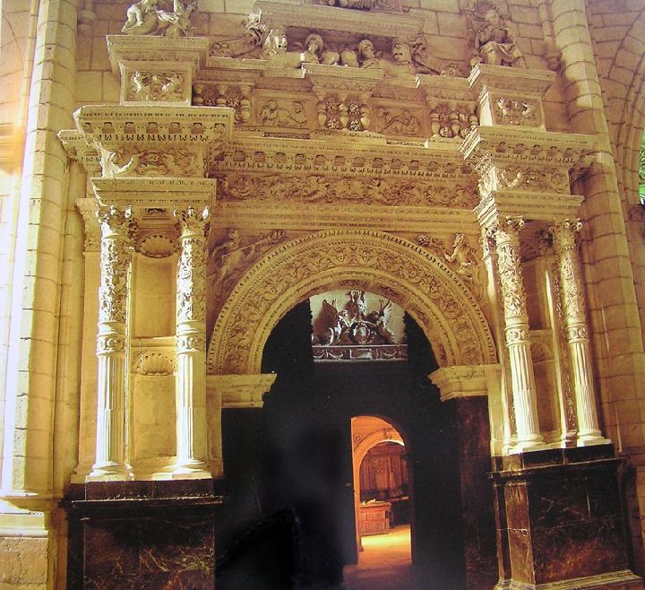 La puerta de entrada, con dos hojas de madera repletas de motivos renacentistas, obra también de Quijano, se enmarca con un arco de medio punto donde, tanto el intradós como la zona de salmeres y los tímpanos, quedan decorados con guirnaldas, rosetones o esculturas de altorrelieve. Fuera de este arco de entrada se desarrolla toda la arquitectura propia de los arcos de triunfo, columnas pareadas y un entablamento profuso donde se suceden en dos frisos los motivos decorativos, ya sean los propios del renacimiento o los estipulados por los órdenes clásicos. Todo el entablamento queda coronado por las alegorías de las virtudes teologales, Fe, Esperanza y Caridad.