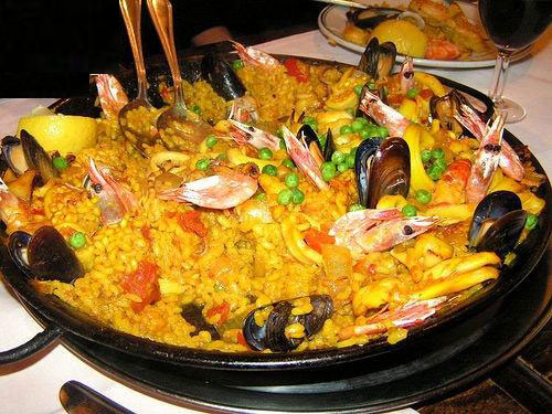 Ingredientes: 1 kilo de calamares, 1/2 kilo de mejillones (en estado natural y con cáscara), 1/2 kilo de langostinos (gambas o camarones), 2 morrones grandes verdes, 1/4 kilo de chauchas, 1 kilo de arvejas frescas, 2 alcauciles, 2 tomates, 1/2 cabeza de ajo, 1/2 kilo de arroz, 1 litro de agua, 125 cc. de aceite (1/2 taza), azafrán en hilo (5 o 6 hilos), una cucharada de sal, 1 ramo de perejil.