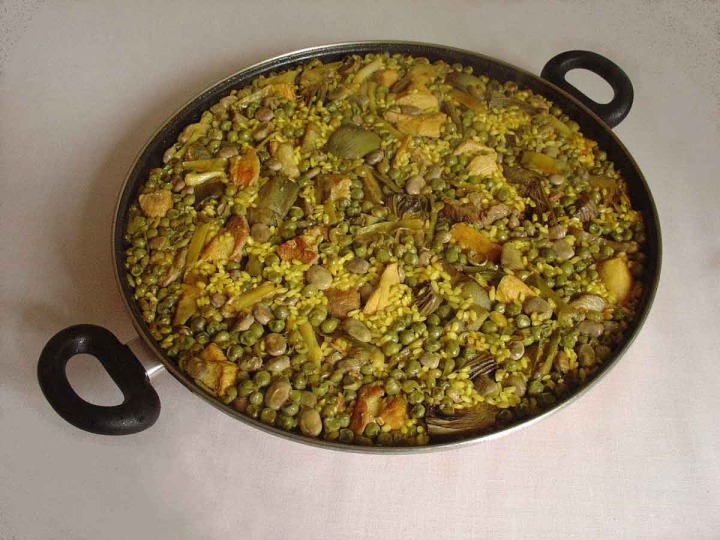 Preparación: Freír los morrones cortados en 4 pedazos, retirarlos, poner las chauchas cortadas de 1 cm, luego de un rato de cocción se le agrega las habas, las arvejas y los alcauciles cortados en 4 trozos c/u, después los tomates en trozos pequeños para freír todo junto, revolver y cuando está sofrito se agrega el arroz. En el mortero se debe preparar el ajo con el azafrán, la sal y el perejil, machacar bien agregar agua y luego poner todo en el arroz que debe estar bien impregnado con el aceite y darle una vuelta para mezclar todo con esta poca agua, luego se le agrega el litro de agua se acomoda bien en la paellera y se le pone los morrones encima en forma decorativa (a gusto) Bastante fuego para que se cocine todo alrededor, parejo sin revolver para nada y dejar que evapore el agua.
