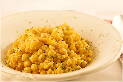 Preparación: Remojar los garbanzos durante 12 horas con 1 cucharadita de bicarbonato, luego hervirlos en abundante agua que debe estar hirviendo en el momento de poner los mismos en ella, no se debe agregar sal al agua. Una vez prontos, reservarlos. En una cacerola poner el aceite a calentar, añadir las papas peladas y cortadas en rodajas finas, luego el tomate pelado y cortado en pedazos chicos también. En un mortero se ponen los ajos pelados y cortados a la mitad, el perejil, y la sal y se muele bien todo esto. A la Preparación de papas y tomates se le agrega el arroz, se mueve un poco y se deja cocinar unos minutos, luego se le echan los garbanzos escurridos, se mezcla todo muy bien y se le pone lo del mortero que se enjuagará con 1/2 taza de agua caliente para completar las 2 tazas que lleva la Preparación. Se deja hervir hasta que el arroz esté cocido, a fuego fuerte.
