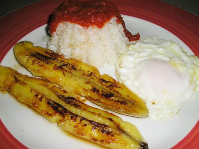 Preparación: Hervir el arroz. Primero condimentar y freír la carne, las bananas y los huevos, todo por separado. Hacer la salsa poniendo un poco de aceite en una cacerola, agregar los tomates picados y 1 cucharadita de azúcar, cocinar hasta que los tomates estén prontos. Se le agrega sal a todo menos a las bananas. En un plato se pone el arroz solo y después cada persona se sirve a su gusto, los otros componentes.