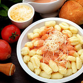 Preparación: Pelar y cortar las papas, poner a hervir con sal, cuando están prontas hacer un puré en caliente. Agregar la harina que sea necesaria para tomar la masa, amasar hasta que quede lisa y no se pegue a las manos, se hacen rollos y se cortan los ñoquis que se pasan por un tenedor o por el rallador de queso en su parte gruesa para que forme el ñoqui o usar el aparato especial de hacer ñoquis. Para hervirlos poner abundante agua, 1 cucharada de sal y 3 cucharadas de aceite. Se sirven con queso y manteca. O con salsa de tomates.