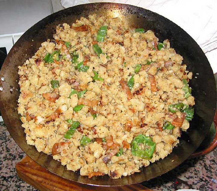 Preparación: Se pone el pan a remojar con agua fría, cuando se nota bien remojado se exprime bien. En una sartén se pone a calentar el aceite, se le agrega los ajos pelados y enteros y los cuatro pedazos de tocino, cuando están dorados los trozos de tocino se sacan de la sartén y se reservan. En ese aceite se pone el pan, se cocina dándole vueltas como si fuera una tortilla. Cuando está bien dorado de los dos lados es que está pronta. Se sirve colocándole encima el tocino, y se acompañan con: uvas frescas, higos frescos, aceitunas, cebolla en rodajas, por supuesto que con una sola de ellas. Al que no es abstemio, va bien acompañar las migas con vino. Esto es un desayuno.