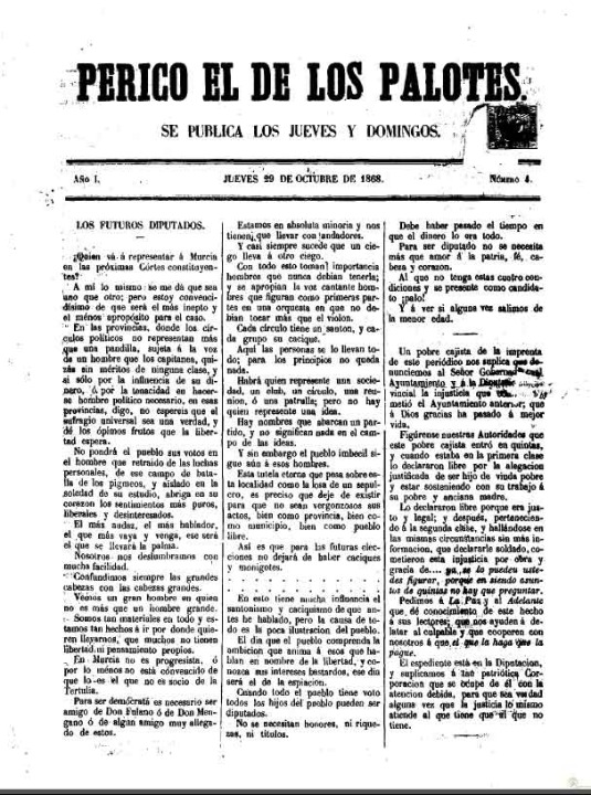 La Constitución de 1869 defendía como uno de los derechos inherentes al hombre la libre expresión del pensamiento por la imprenta, prohibía la censura previa y todo mecanismo preventivo de cualquier tipo. En este panorama que proporcionaba un estado de libertad para la prensa desconocido hasta entonces, surgieron en la Región muchas publicaciones periódicas políticas, satíricas y culturales. Entre los periódicos políticos, los había de todas las tendencias: democráticos como El Huracán (Lorca 1868), Diario Democrático de Cartagena, El Eco del Pueblo (Murcia 1869); republicanos, por ejemplo La Traca y Perico el de los Palotes (Murcia 1868), El Radical (Cartagena 1869), El Zorongo (Murcia 1870), El Obrero (Murcia 1871), La Avanzada (Lorca 1872); conservadores como El Buen Deseo (1868), El Aguijón (Murcia 1870), El Ideal Político (Murcia 1871) o El Noticiero (Murcia 1872); liberales: Adelante o El Arco Iris (Murcia 1868),etc. También fueron numerosas las revistas culturales y literarias como el Ateneo lorquino (Lorca 1871), Cartagena Ilustrada (Cartagena 1871) que fue la primera publicación ilustrada de la Región, y las publicadas en Murcia en 1871: La Ilustración Murciana, El Aura Murciana, y en 1872: El Chocolate, La Violeta, etc.