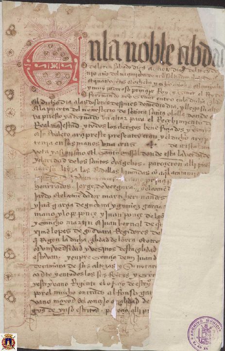 Juan de Alcocer, notario de la ciudad de Lorca, ha sido el encargado de dar testimonio de la entrada del Rey don Fernando en ella. Su Alteza llegó a la puerta del monasterio de Nuestra Señora Santa Olalla, donde estaba puesto y adornado un altar para el recibimiento de su real majestad, estando todos los clérigos y el arcipreste Johan Valero presentes, portando éste en sus manos una cruz de cristal muy devota y el santo misal. Tras recibir homenaje de los vecinos y jurar sus fueros, su Alteza cruzó la ciudad para subir al castillo.