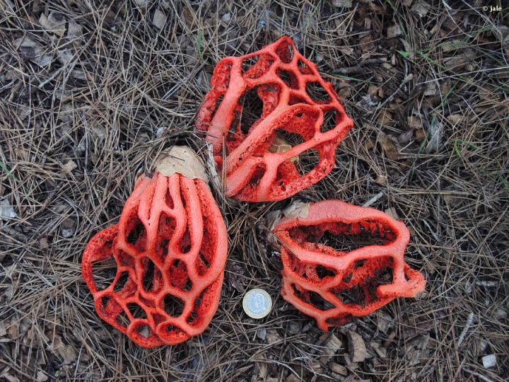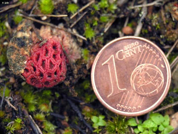 Es similar, aunque notablemente –y siempre– más pequeño que Clathrus ruber, a lo sumo de 2-3 cm de diámetro, el colo rojizo (Colus hirudinosus), igualmente maloliente, pero de apariencia más higrófana, que además presenta una evidente y marcada hendidura o línea media entre los espacios del cuerpo fructífero.