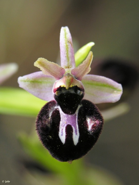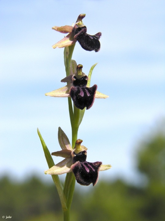 Hierba perenne, bulbosa, con dos tubérculos elipsoideos, de tallos glabros de hasta 60 cm de longitud. Hojas en roseta basal, alargadas, de hasta 8 cm, algunas caulinares, envainando al tallo, oval-lanceoladas, a lo sumo 3. Inflorescencia en espiga laxa, con 3-8 flores, sésiles. Brácteas verdosas, algo más largas que el ovario, lanceoladas. Sépalos verdosos, oval-lanceolados y pétalos variables en tamaño, siempre mas cortos y estrechos que los sépalos, anchamente lanceolados, extremo truncado, bordes ondulados. Labelo de 10-15 mm de largo, prácticamente orbicular, entero, con dos protuberancias laterales, muy características, y margen con pelosidad larga; interior pardusco, muy oscuro, casi negro, aterciopelado, con mácula en forma de H. Cavidad estigmática pardo oscura a negra, estrechada en su base, que presenta por encima dos manchas, a modo de pseudocelos, y una punteadura centra azul oscuro o negra, bordeada azul claro y blanco. Ginostemo erecto y ovario de hasta 2 cm de longitud, que se transforma en fruto de tipo en cápsula, que contiene miles de semillas.