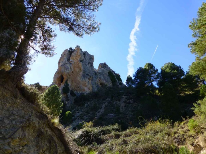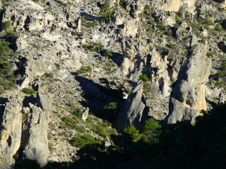La constante subida por la pista forestal se olvida pronto al ver el surrealista paisaje dolomítico de la cabecera del Barranco del Cantalar (2,7-4 km). Es la razón de ser de este importante lugar de interés geológico de la Región de Murcia. Está formado por numerosos y magníficos pináculos de dolomías, algunos de decenas de metros, que la naturaleza, desde hace miles de años, está esculpiendo caprichosamente. Esculturas naturales algunas sin formas definidas, otras que recuerdan a grandes frailes (así los denominan las gentes del lugar), a dedos erguidos, a prehistóricas almenas, a los moais de la Isla de Pascua… Junto a la pista y llevando cuidado, podemos bajar por un barranco y dar un corto paseo por parte de este laberinto dolomítico. Será un placer para los sentidos que ayudará a cumplir el deseo de fotografiar, y fotografiarse, con estos aislados y elegantes caprichos de la Gea.