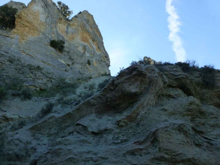 Un segundo camino, a 1,8 km, por un frondoso bosque nos lleva de nuevo a la base del Barranco del Cantalar. Cuidado con el borde, porque en algunos tramos, el camino pasa por el filo de una alta ladera margosa, casi vertical. Este camino discurre mayoritariamente por estratos de margas y margocalizas tableadas con algunos ammonites, sobre las que en ocasiones se han formado suelos de umbría, evolucionados, con algunos ponentes horizontes A, e incluso B (mollisoles y cambisoles). El camino termina en una zona donde bruscamente cambia la litología y el cauce del Barranco del Cantalar se convierte en un pequeño pasillo, casi intransitable. Aquí aparecen por primera vez calizas de color gris que forman un importante escarpe, y que genera la cima del Cerro de la Molinera. Este estrato vertical está esculpido con caprichosas cavidades, y en su base tiene depósitos de canchales.