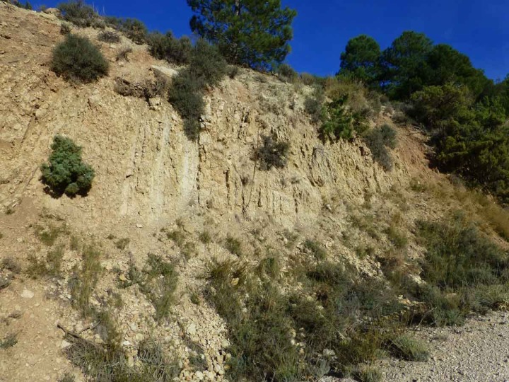 A 900 metros del camino que asciende hacia el Cantalar, desde que termina la carretera, encontramos una cantera de gravas de color rojizo, un recurso geológico que los canteros denominan zahorra. Se trata de un piedemonte, una acumulación de sedimentos generada por la erosión de las laderas de la sierra. En los taludes de la cantera se aprecian detalles geológicos de interés didáctico:
