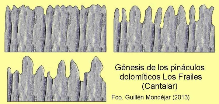 • Estratificación y pliegues. A veces aparecen intercalaciones de rocas menos duras como arcillas de color rosado, más fáciles de erosionar. Aunque en general están mal estratificadas, se constata que muchos de estos pináculos están alineados. Son restos más resistentes de estratos verticales parcialmente erosionados, e incluyo afectados por grandes pliegues, como el que se intuye en la ladera oriental del manantial del Cantalar.