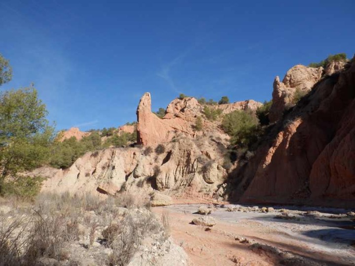 La primera corresponde al curso bajo de la Rambla, entre el transvase Tajo-Segura y en los alrededores de la presa de contención; en su margen izquierda se observa una profunda erosión de las lutitas rojas continentales, que ha afectado a una antigua conducción de agua y que ha dado lugar a una espectacular chimenea de hadas, coronada por un paquete conglomerático que recuerda a un cuerno de rinoceronte. En este lugar también se observa la total colmatación por sedimentos de la presa realizada recientemente para mitigar los brutales procesos erosivos de la zona.