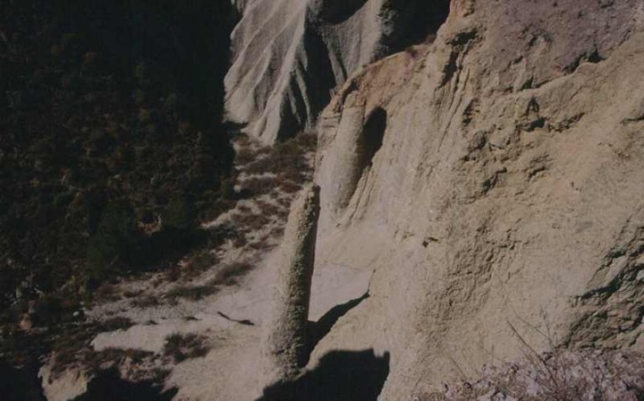 Pero de todas las singularidades geomorfológicas de la Rambla de Librilla, sin duda las más espectaculares se ven paseando por el cauce del Barranco del Infierno, igualmente atravesado por varios diques totalmente colmatados. Desde la desembocadura con la Rambla de Librilla, el barranco se va encajando sobre las margas y margocalizas marinas hasta llegar a su tramo medio, donde aparecen espectaculares paredes verticales de cerca de cincuenta metros de altura que la erosión hídrica, aprovechando la existencia de grandes diaclasas, ha seccionado originando espectaculares galerías verticales asociadas a fenómenos de tubificación, piping. El lugar presenta una morfología semejante a una gran muralla en ruinas con numerosas almenas, de entre las que destaca una chimenea de hadas, totalmente columnar, de más de diez metros de altura, con unos dos metros de diámetro en su base y pocos decímetros en el techo.