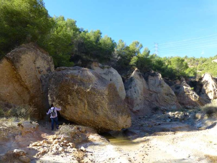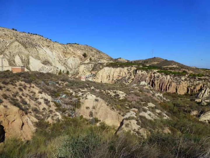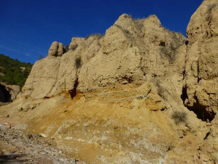 c) Mineralógicos y geoquímicos. Los sedimentos presentan minerales que son muy influyentes en los procesos de disgregación de la roca por su capacidad de cambiar de volumen según la humedad: esmectitas, paligorskita y anhidrita. También presentan concentraciones importantes de sales, debido a su origen marino, como sulfatos y cloruros. Esta composición geoquímica favorece la disgregación de la roca por fenómenos de haloclástica y la pérdida de estructura de los sedimentos arcillosos y del suelo edáfico que en ellos se forman. El tipo de catión de cambio presente condiciona este fenómeno siendo máximo para los cationes litio y sodio. En verano, es común encontrar en los cauces de los barrancos y en las superficies de cizalla concentraciones importantes de sales.