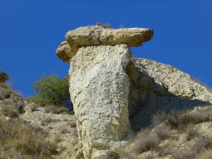 b) Litológicos y estratigráficos. Las alternancias de diferentes tipos de rocas y el grado de compactación y cementación, afectan a la permeabilidad y a las propiedades mecánicas de las rocas como es la cohesión, la resistencia a la rotura y la facilidad de disgregación por el agua (índices de Atterberg). Esto conlleva a formas erosivas muy variadas en Gebas. En materiales competentes, duros, al noreste de Gebas, las formas son más abruptas: grandes piping que evolucionan a barrancos con paredes verticales y cabeceras circulares de decenas de metros, estructuras en forma de puentes, túneles naturales, chimeneas, etc. Sin embargo, en las margas blancas marinas del centro de Gebas, fácilmente deleznables, predominan los barrancos con paredes inclinadas, formando el típico paisaje de bad lands. Tan solo las costras calizas e intercalaciones de conglomerados del glacis pleistoceno, frenan la erosión de estas margas.