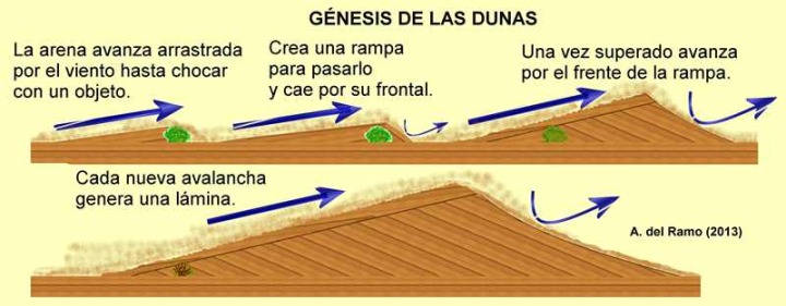 El socavamiento (nicho basal) de la base de la formación dunar por el oleaje, ha generado una ilustrativa cornisa que retrocede mediante desplomes, originando una costa caótica de bloques de aspecto laberíntico.