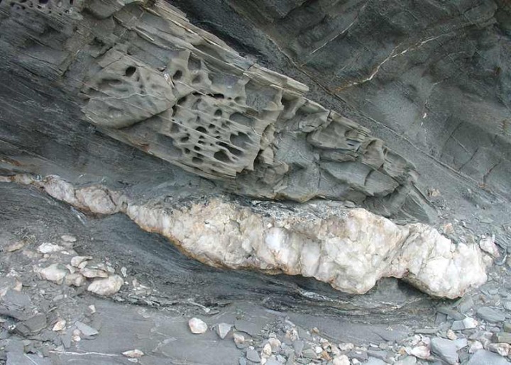 Los esquistos grafitosos paleozoicos donde las cuarcitas intercaladas presentan un aspecto lenticular en corte (boudines, del francés morcilla) debido a su comportamiento más rígido y menos comprimible que los materiales arcillosos más plásticos y deformables, que originaron los esquistos.