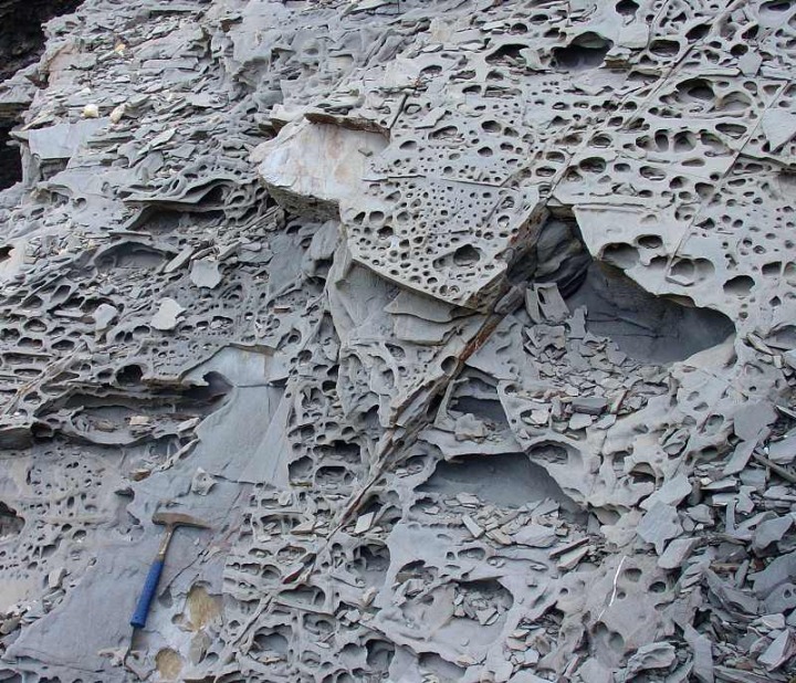 También podemos observar que la superficie de los esquistos está salpicada de pequeñas cavidades (alveolos) generadas por la haloclastia llevada acabo por el espray del oleaje.
