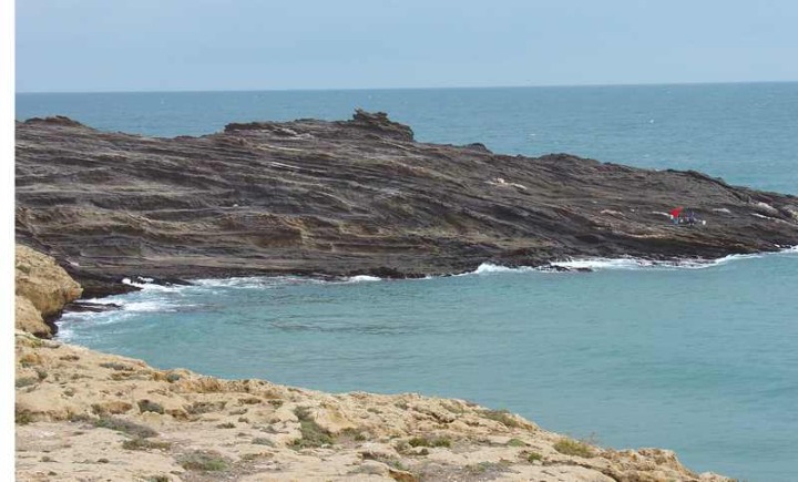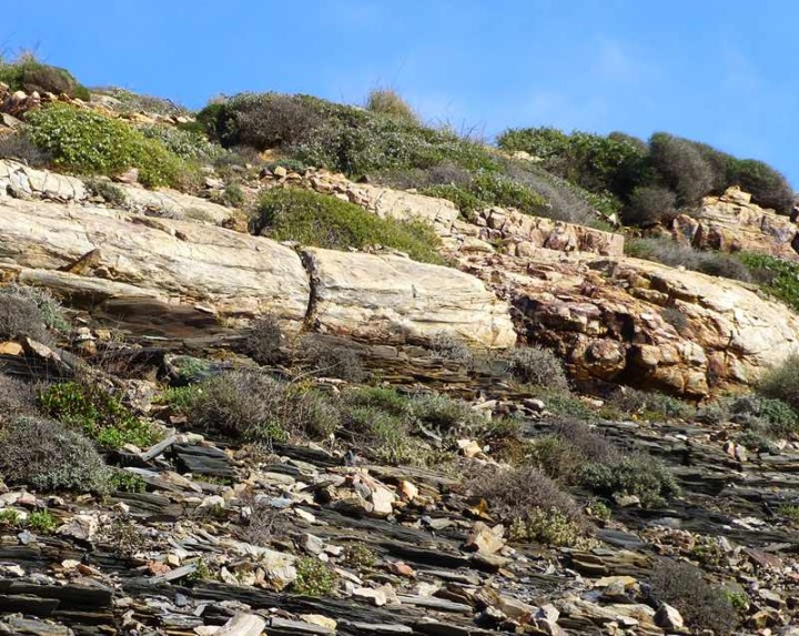 La plataforma de abrasión labrada por el oleaje en los esquistos y en paleodunas.