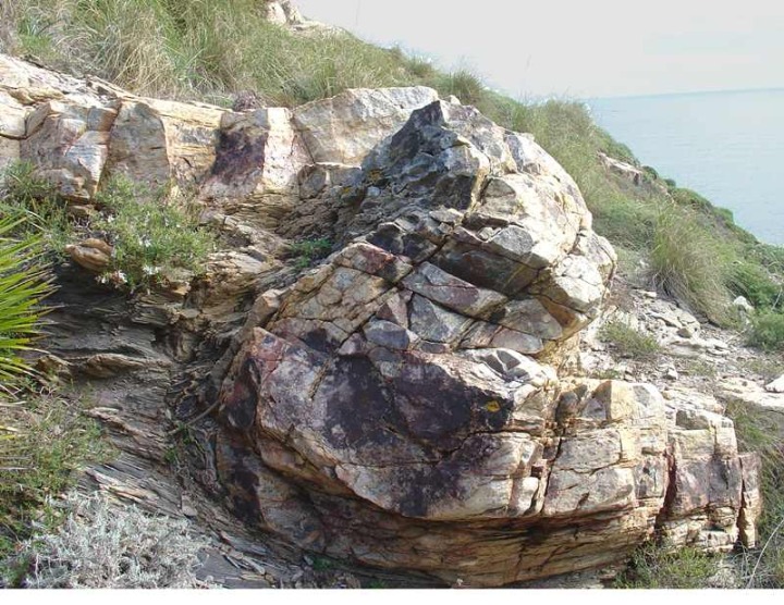 Si miramos en el lado contrario de la cala podemos volver a observar una discordancia entre los esquistos y los materiales cuaternarios. Pero quizás sea lo más llamativo observar que Punta Espada es un espectacular pliegue acostado. Los esquistos que lo originan están, al igual que en la parada anterior, muy diaclasados, pero aquí las fracturas aparecen rellenas de cuarcita.