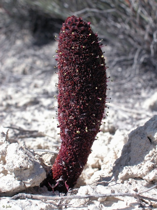 Planta perenne, que tiene órgano subterráneo engrosado y tuberoso, con numerosas raíces modificadas –para parasitar a otras plantas (haustorios)– filiformes. Tallos carnosos, hinchados, primero cilíndricos, finalmente con forma de maza o porra, de hasta 20 cm, rojizos o de intenso morado, a veces casi negros, sin clorofila, aparentemente sin hojas, que están reducidas a escamas, triangulares, cortas, distribuidas irregularmente, con margen dentado. Flores pequeñas, unisexuales, dispersas y mezcladas, muy numerosas, centenares, apretadas unas con otras en la parte superior ensanchada del tallo, ocupando aproximadamente dos terceras partes de éste, unisexuales, mezcladas, de simetría pentámera, inconspicuas y apenas diferenciables, de las que sólo destacan los estambres, de coloración menos oscura que el resto de la planta, con filamento rojizo y antera violácea. Fruto de tipo núcula, con una única semilla.