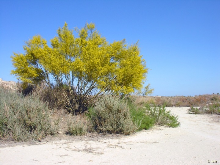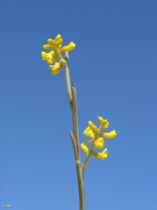 Arbusto alto, de hasta 3 m de altura, con numerosas ramas principales, gruesas, que parten desde la base, de corteza agrietada, rugosa, grisácea y algo amarillenta. Tallos con ramillas abundantes, seríceas o de tacto áspero, con estrías longitudinales y hojas lineares, pronto caducas. Flores muy pequeñas, menores de 1 cm, papilionadas, agrupadas en abundantes inflorescencias racemosas, cortas, de 3-5 cm de longitud. Fruto seco e indehiscente (que no se abre), de tipo legumbre, subglobosa u ovoidea, con forma arriñonada, apiculada, persistente en la planta tiempo después de su maduración, que contiene una única semilla, raramente 2, subesférica, negra.