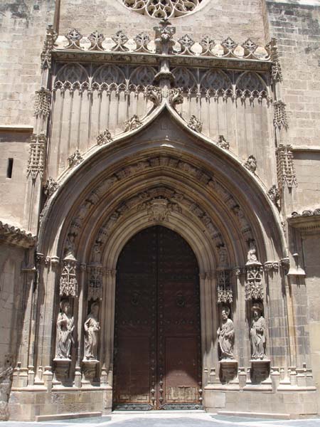 Siguiendo con la escultura en piedra y aunque sea parte de la arquitectura de la catedral, podemos considerar la escultura de la Puerta de los Apóstoles, de finales del XVI y que podría describirse como gótico florido. Un programa iconográfico dedicado a los apóstoles Pedro, Andrés, Pablo y Santiago y con sus roscas dedicadas a describir escenas del Antiguo Testamento y del Libro de las Revelaciones. Diversos estudios dieron con restos de policromía en las figuras, algo más común en la escultura de piedra de lo que se cree y que hubiera dado como resultado una portada llena de colores vivos.