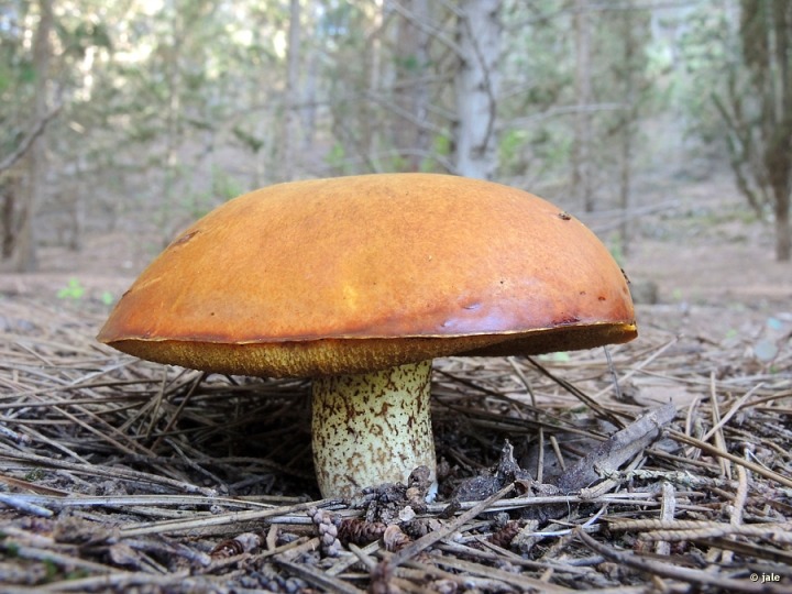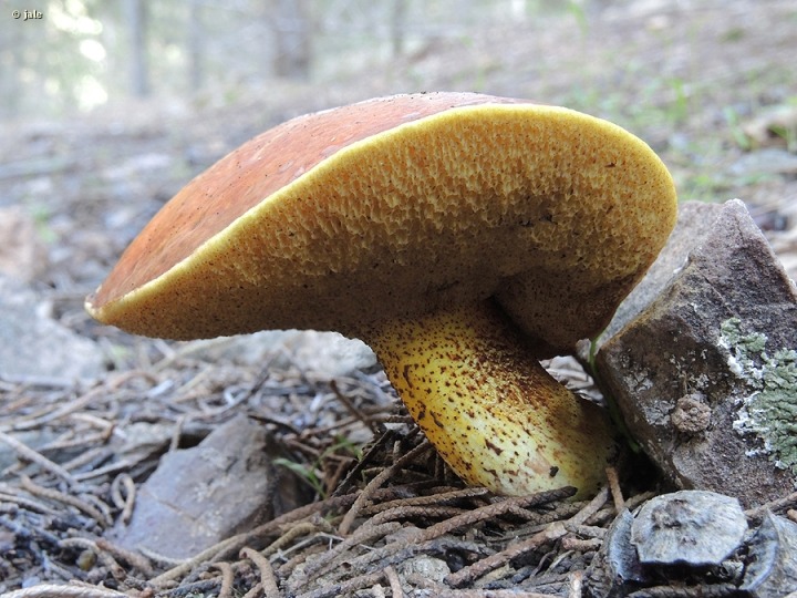 Hongo micorrízico de coníferas, con cuerpo fructífero (seta) de aspecto hemisférico o convexo, de hasta 20 cm de altura. Sombrero primero campanulado y después extendido, de hasta 10-12 cm de diámetro, con parte inferior (himenio) porosa, sin láminas, y parte superior lisa, habitualmente viscosa, de color marrón claro, ligeramente anaranjado, sin verrugas ni restos, a lo sumo acículas y tierra adheridas del suelo durante su desarrollo. Pie de hasta 8 cm, cilíndrico, sin anillo ni cortina, también desprovisto de volva, con superficie granulada, salpicada de manchas papilosas marrón oscuro, sobre fondo de intenso amarillo. Esporada amarillo olivácea, originada por acumulación de esporas fusiformes.
