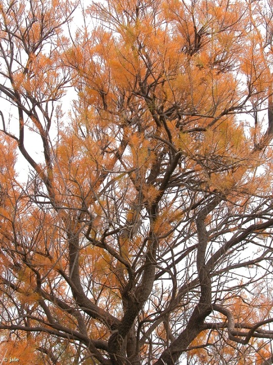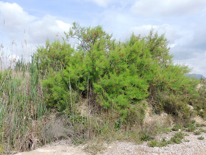 Arbusto alto, de hasta 5 m, con frecuencia de porte arborescente, aunque pocas veces con tronco definido de árbol. Tallos muy ramificados, lampiños, flexibles, por lo común de corteza pardusca, algo rojiza, sólo verdes en brotes jóvenes. Hojas enteras, triangulares o lanceoladas, sin peciolo, de hasta 4 mm, verde glaucas, anaranjadas al final del otoño, antes de caer, con papilas y glándulas excretoras de sal. Flores tetrámeras, de cuatro pétalos, blancos o rosados, de hasta 4 mm de longitud, en inflorescencia espiciforme provista de brácteas que destacan por su tamaño, particularmente concentradas en la base. has soldados en receptáculo hinchado, libres en su extremo, donde se presentan Fruto de tipo cápsula, ovoide, piramidal, de reducidas dimensiones, no mayor de 8 mm, que contiene numerosas semillas, diminutas, con pelos en uno de sus extremos.