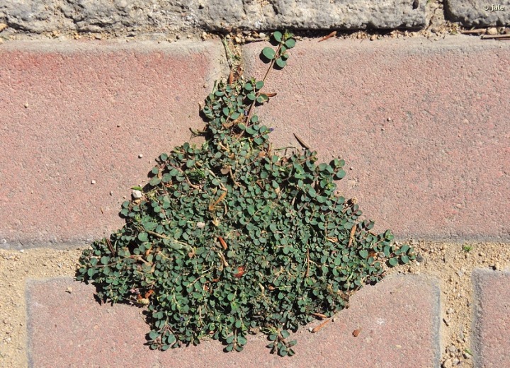Herbácea anual, rastrera, postrada, con tallos reptantes, prácticamente pegados al suelo, que levantan apenas unos centímetros, ligeramente crasos, glabros, verde oscuros, rojizos en su senectud, que desprenden una sustancia blanquecina algo pegajosa al ser cortados. Hojas de contorno irregular, asimétrico, falcadas, con expansión a modo de aurícula en su base, sésiles, emparejadas, con nervio central marcado, de hasta aproximadamente 1 cm. Flores en inflorescencia típica de la familia (ciato), una “falsa flor” de aspecto globoso, pedunculada, compuesta por flor femenina central, en la que destaca un ovario peltado, rodeado de estructuras convergentes, que portan nectarios elípticos o reniformes, entre las que quedan comprendidos los estambres de varias flores masculinas. Fruto de tipo cápsula, ovoideo, redondeado, colgante, que contiene numerosas semillas, piriformes, provistas de pequeña punta en su extremo, de hasta 3 mm de longitud mayor.