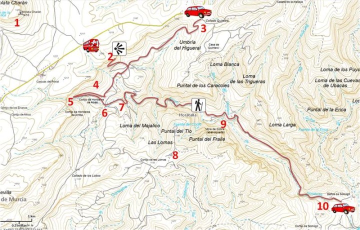 El barranco de Hondares comienza muy cerca de la pedanía de las Casicas de Portal (Moratalla), se accede a su cabecera por la carretera que une Benizar con el Sabinar. El recorrido que se propone es para hacerlo a pie, unos 5,5 km hasta los Baños de Somogil, o 8 km hasta el camping de La Puerta. Para ello los coches se pueden dejar en los siguientes lugares: