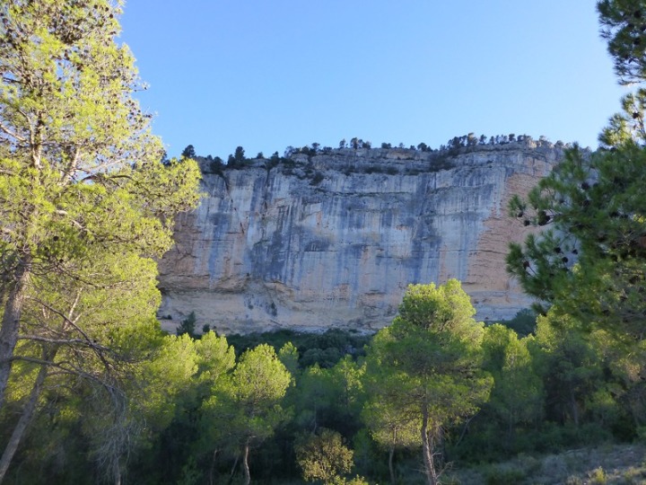 Vista frontal de los cenajos de Somogil. Sobre ellos las formaciones cretácicas, en la base, y jurásicas, en las cimas de las sierras de los Álamos y Frontón