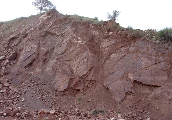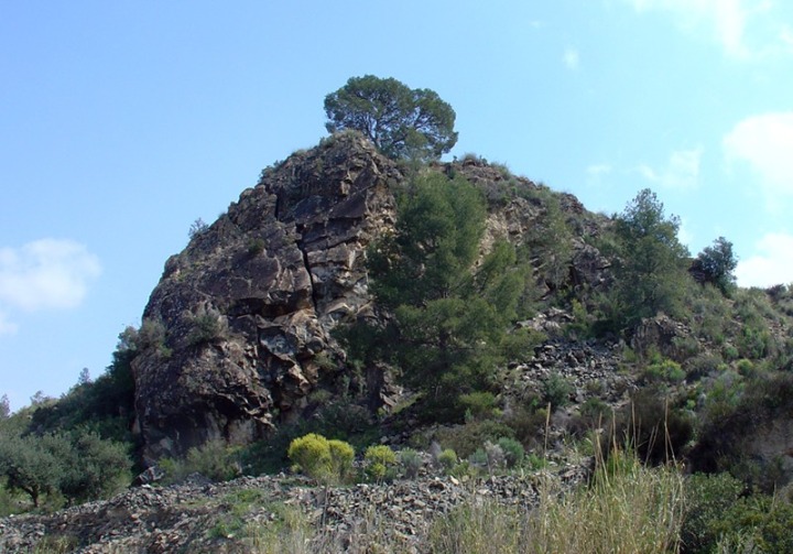 Afloramiento de ofitas en las proximidades de la casa del Trabuco. Al pie de las mismas los resto de una infraestructura hidráulica