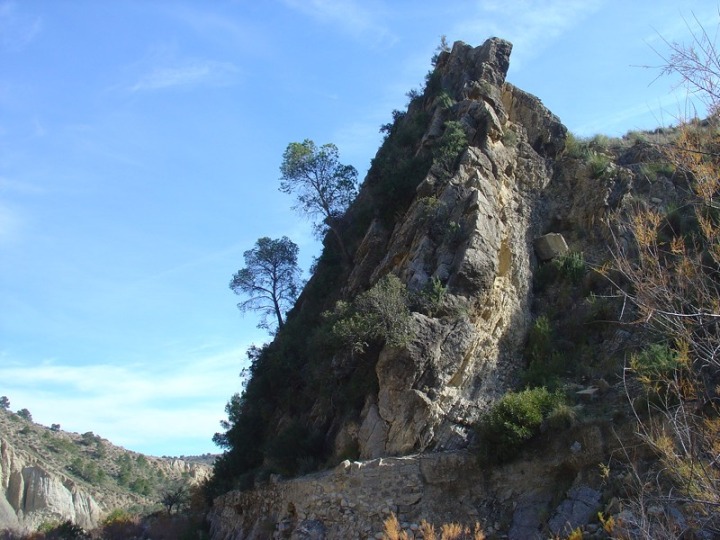 Estratos de margocalizas cretácicas verticalizados por la orogenia Alpina. Al pie de éstos una antigua conducción de agua
