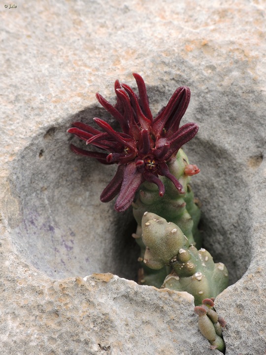 Planta perenne, crasa, con varios tallos, en ocasiones solitarios, pero con frecuencia agrupados, gruesos, cactiformes, de 0,5-1,5 cm de ancho y hasta 25-30 cm de altura, asurcados cuatro o cinco veces. Hojas testimoniales, de 1-3 mm, disciformes, sólo en los tallos jóvenes o rebrotes, por lo común ausentes. Flores pentámeras, habitualmente agrupadas, numerosas, al final de algunos tallos, de 7-10 mm de diámetro, con piezas florales oscuras, purpúreas, lineares, inicialmente como paralelas entre sí, casi patentes, después en ángulo, de aproximadamente 45 grados, rematadas en ápice final, agudo y a menudo blanquecino. El fruto es un bifolículo alargado, de 7-10 cm, que contiene semillas provistas de un penacho de pelos, para su dispersión por el viento.