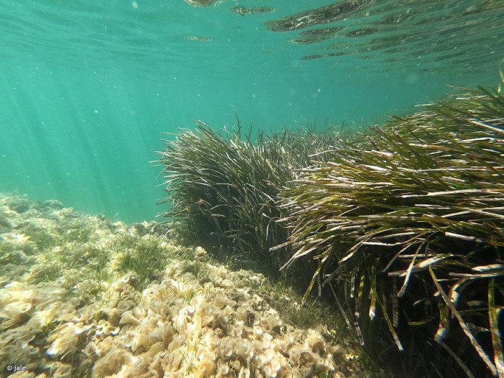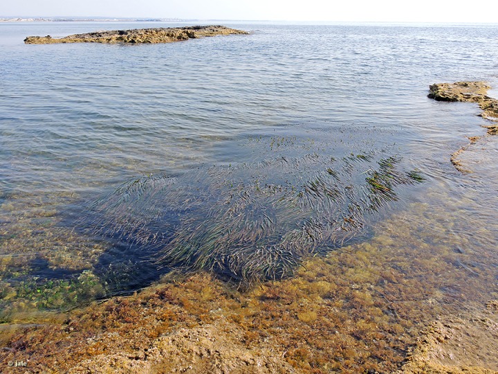 En aguas más someras y menos profundas, con rizoma reptante, hojas acintadas y alargadas, pero más estrechas, menores de 1 cm –generalmente de 0,5 cm– de ancho, puede encontrarse otra fanerógama marina Cymodocea nodosa, común en los fondos arenosos del Mar Menor, cuando no ha sido desplazada por el alga invasora Caulerpa prolifera o desarraigada por la acción humana.