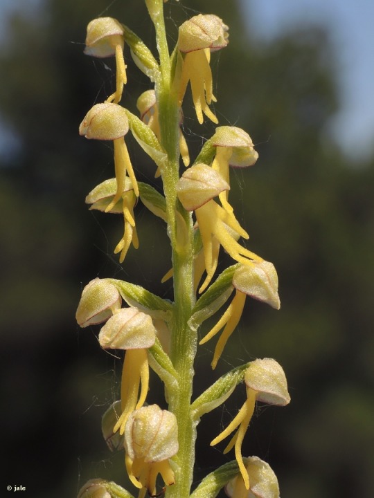 Herbácea, perenne, con tallos verde amarillentos, de 20-25 cm de altura. Hojas 3-5 basales, de oblongas a lanceoladas, las superiores, caulinares, similares, pero más estrechas, hasta envolviendo a la inflorescencia, de tipo espiga, densa, aunque en ocasiones laxa, con flores espaciadas, pero agrupadas, sésiles (sin peciolo), de tépalos externos conniventes, verdes, a veces con reborde rojizo, y labelo corto, de 1-1,2 cm, verdoso-amarillento, o con frecuencia anaranjado, trífido, con lóbulos laterales lineares, y el central bífido, sin espolón; ovario de hasta 1 cm de longitud, retorcido. Fruto de tipo cápsula, con costillas, que contiene miles de semillas en su interior.