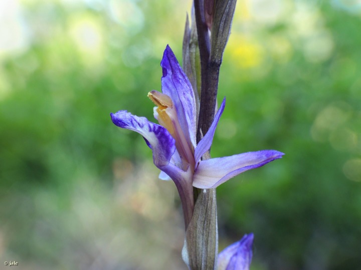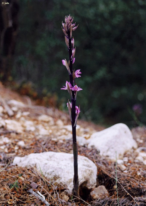 Planta herbácea y perenne, robusta, violácea, glabra (sin pelos), de rizoma grueso, corto, fasciculado, y tallos de hasta 50 cm de altura. Hojas reducidas a escamas, aplicadas al tallo, envainantes. Inflorescencia en espiga laxa, con hasta 20-25 flores, violáceas, grandes, de hasta 4 cm de longitud, y piezas del periantio desiguales, las mayores lanceoladas, las menores lineares, con labelo articulado en dos partes, la externa (epiquilo) oblonga, de márgenes ondulados, con fondo blanquecino, teñido de trazos y manchas de coloración más intensa. Espolón descendente, de hasta 2,5 cm, y fruto de tipo cápsula, pedicelada, oblonga.