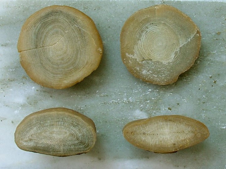 Secciones transversales (arriba) y axiales (abajo) de nummulites. Ejemplares del Aula de la Naturaleza del Rellano (Molina de Segura).